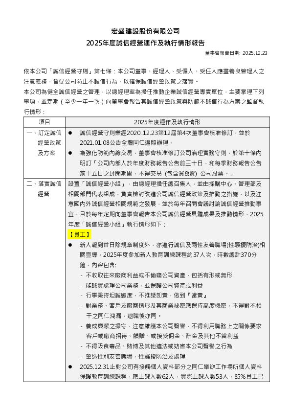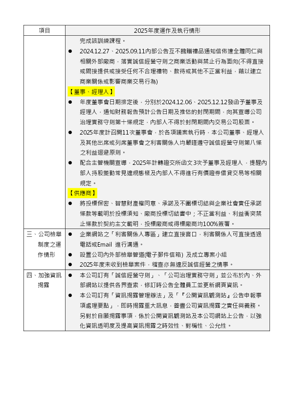 2025年度誠信經營專職單位運作及執行情形