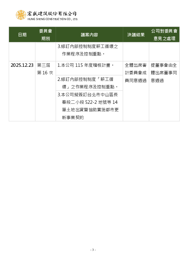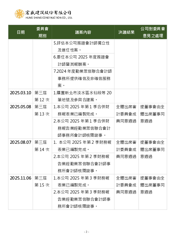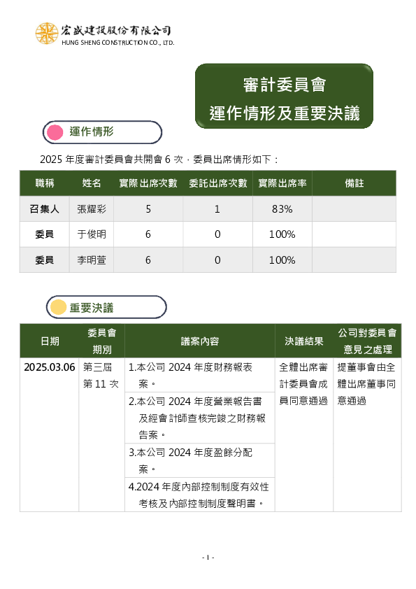2025年度審計委員會運作情形及重要決議